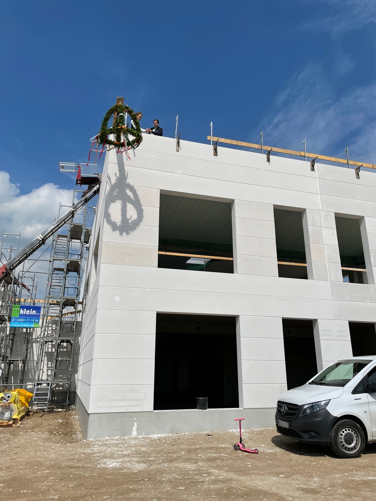 Die Bauarbeiten zu unserem Neubau in Schönberg erreichten am 11. Mai 2022 mit dem Richtfest einen weiteren Meilenstein auf dem Weg zur Fertigstellung.